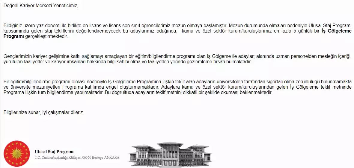 Cumhurbaşkanlığı İnsan Kaynakları Ofisi'nden Merkezimize gelen yazıda: "İş Gölgeleme Programı bir eğitim/bilgilendirme programı olması nedeniyle teklif alan adayların üniversiteleri tarafından sigortalı olma zorunluluğu bulunmamakta ve üniversite mezuniyetleri Programa katılımda engel oluşturmamaktadır . " ifadelerine yer verilmektedir. Bu kapsamda İş Gölgeleme Programına ilişkin teklif alan öğrencilerimizin teklif metnini dikkatli bir şekilde okuması gerekmektedir.