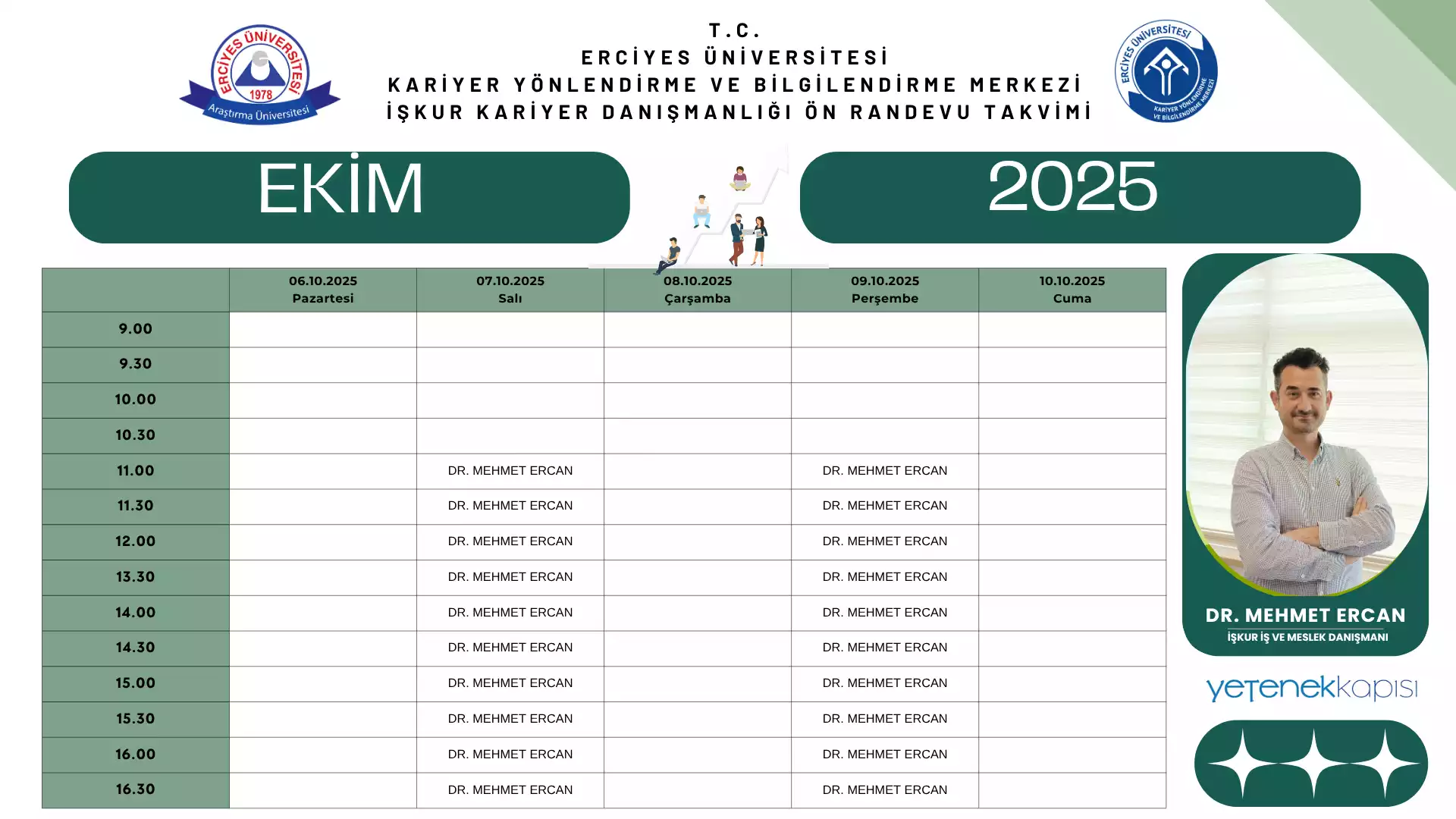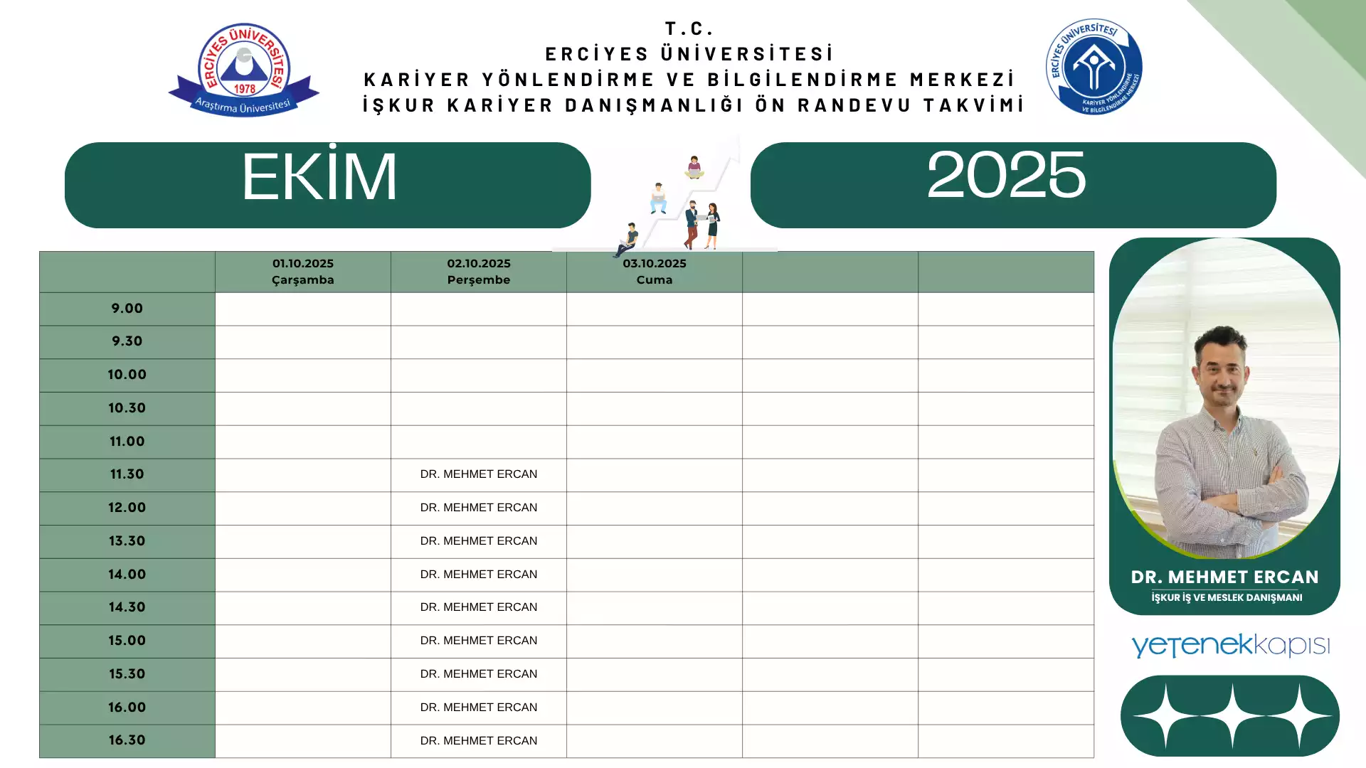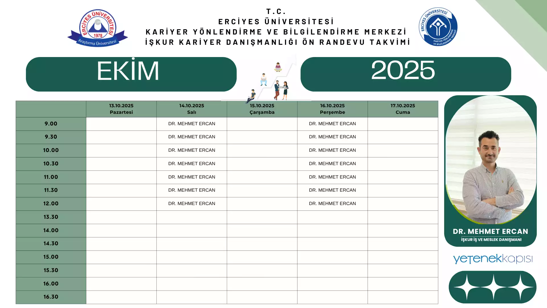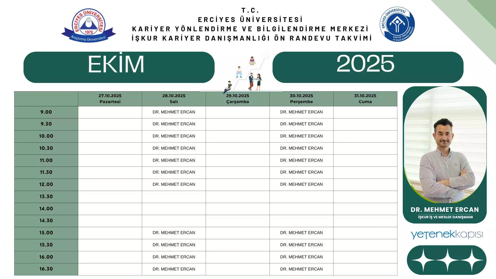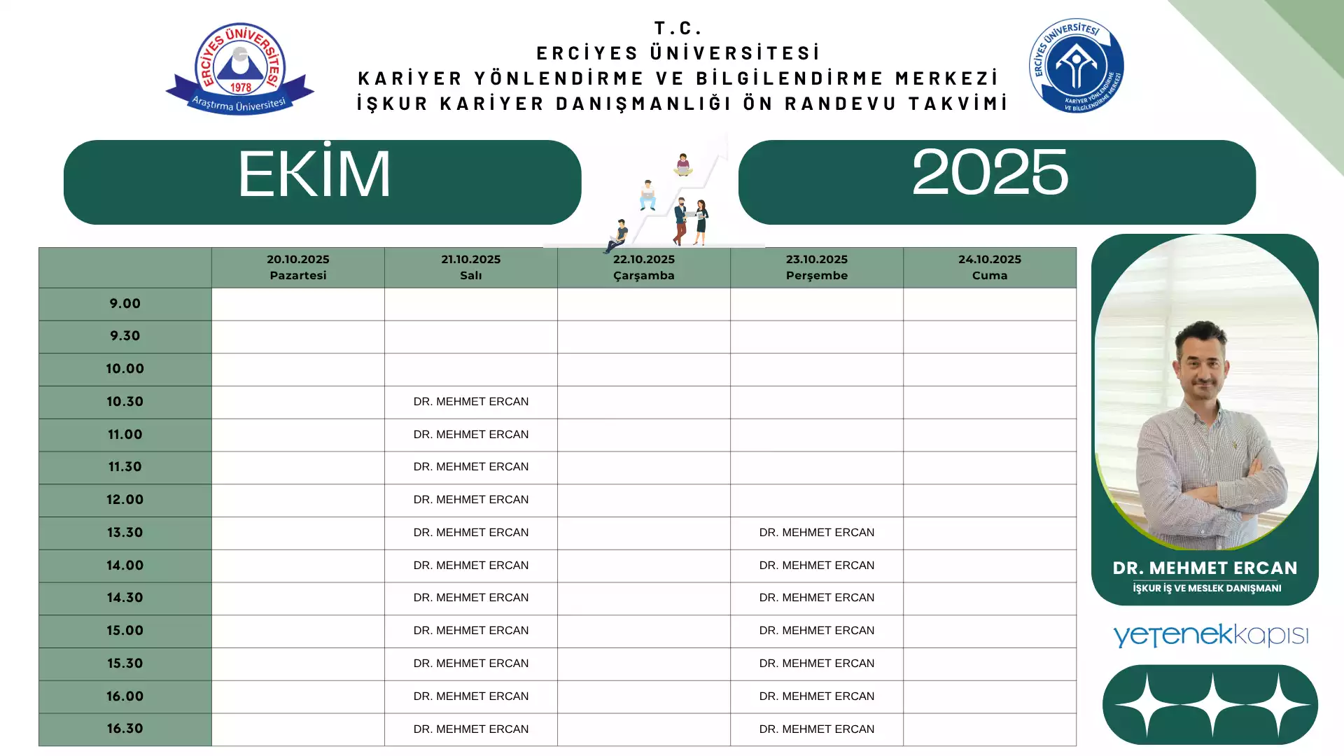 Kariyer Danışmanlığı Ekim 2025 Ön Randevu Takvimi (Dr. Mehmet Ercan)