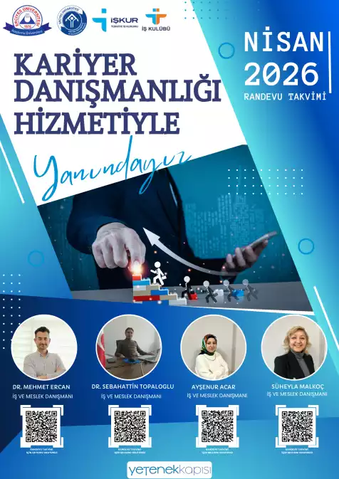 Değerli öğrencilerimiz ve mezunlarımız; Kariyer Danışmanlığı hizmetinden faydalanmak için Yetenek Kapısı – Kariyer Danışmanlığı sekmesinden randevularınızı oluşturabilirsiniz.