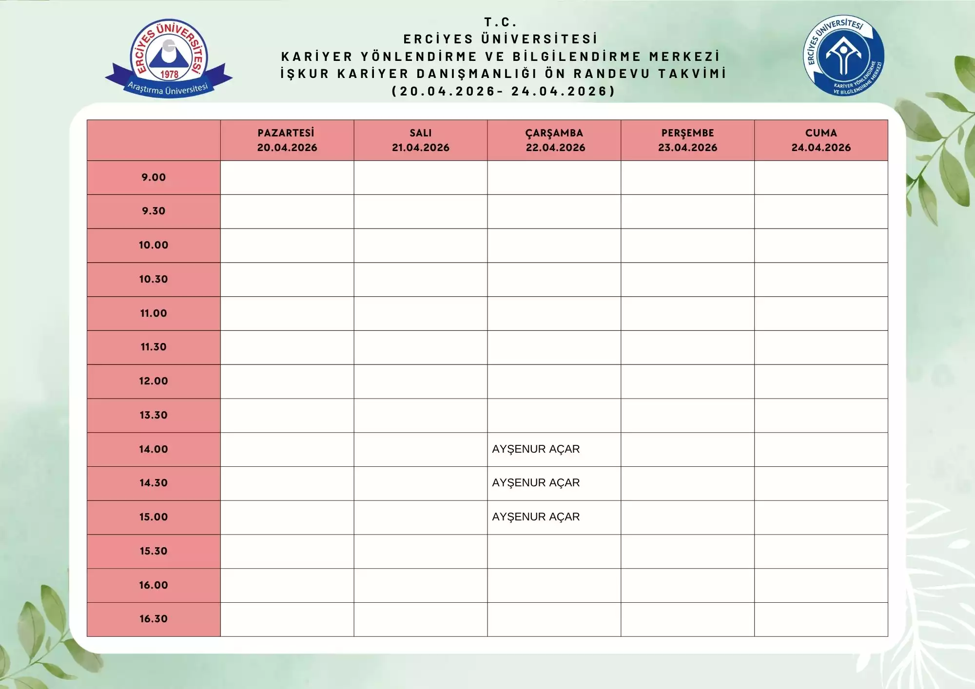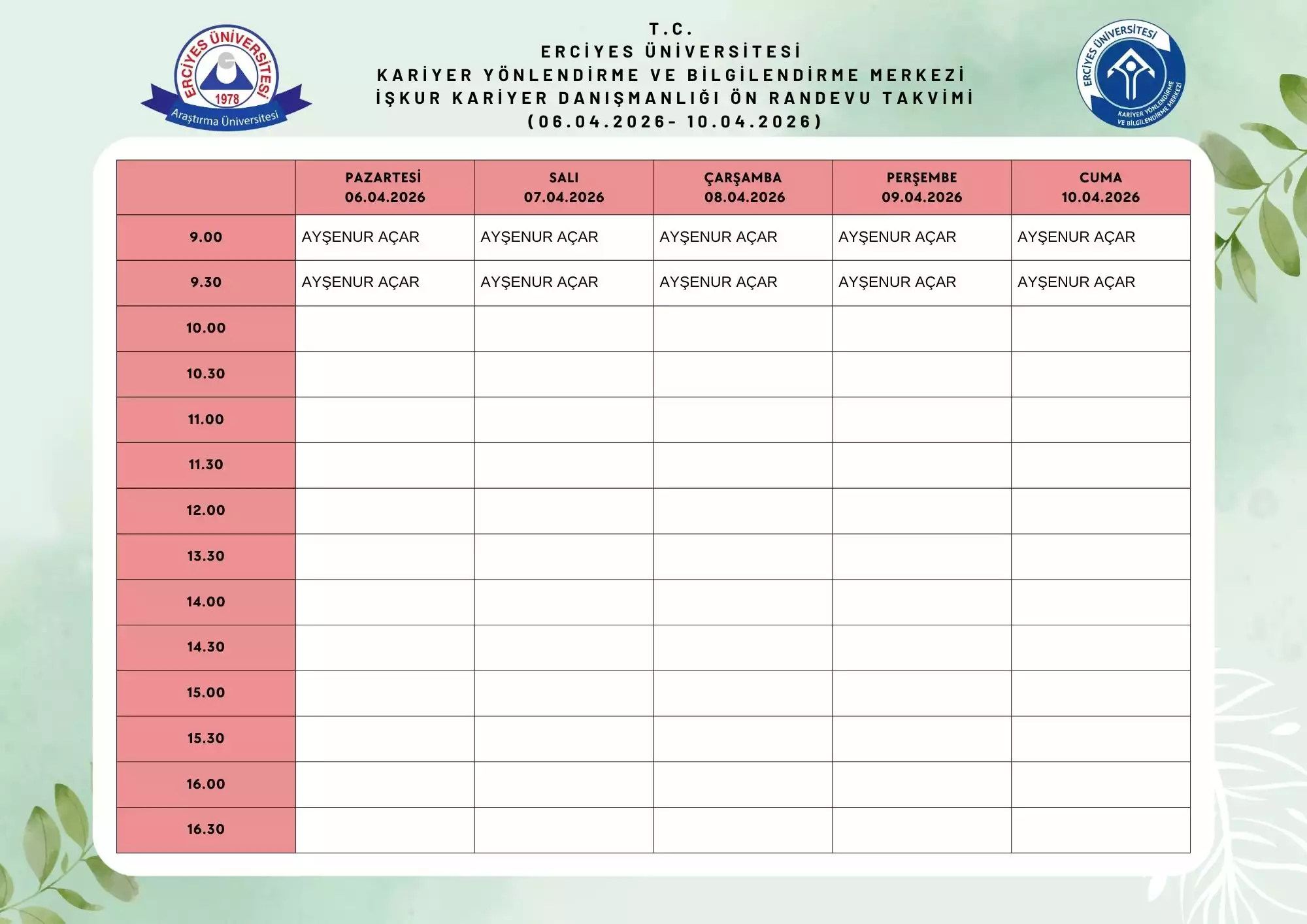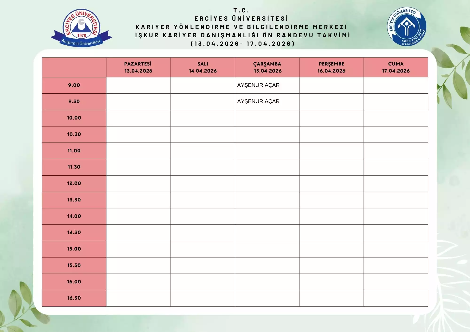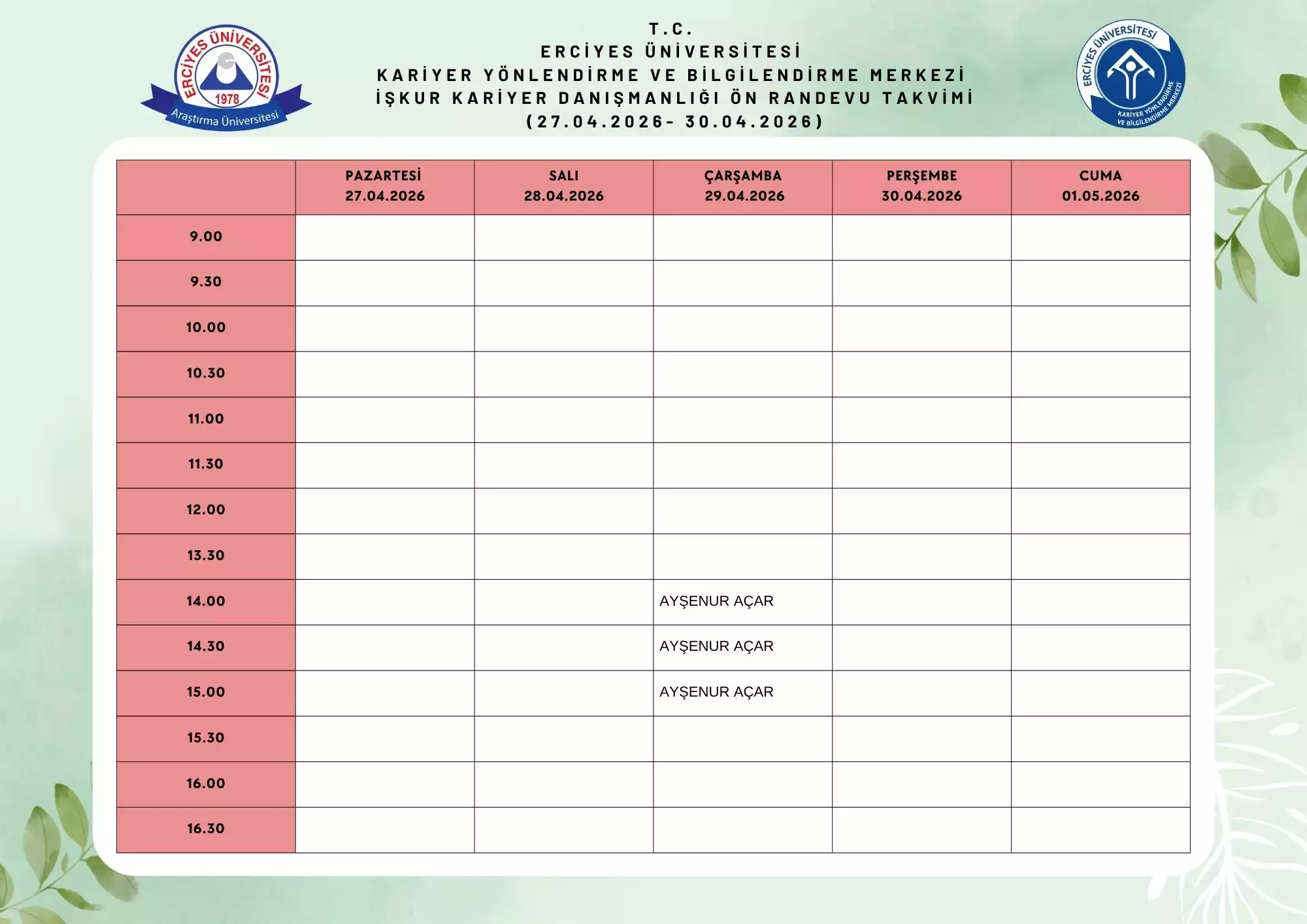 Kariyer Danışmanlığı Nisan 2026 Ön Randevu Takvimi (Ayşenur Açar)