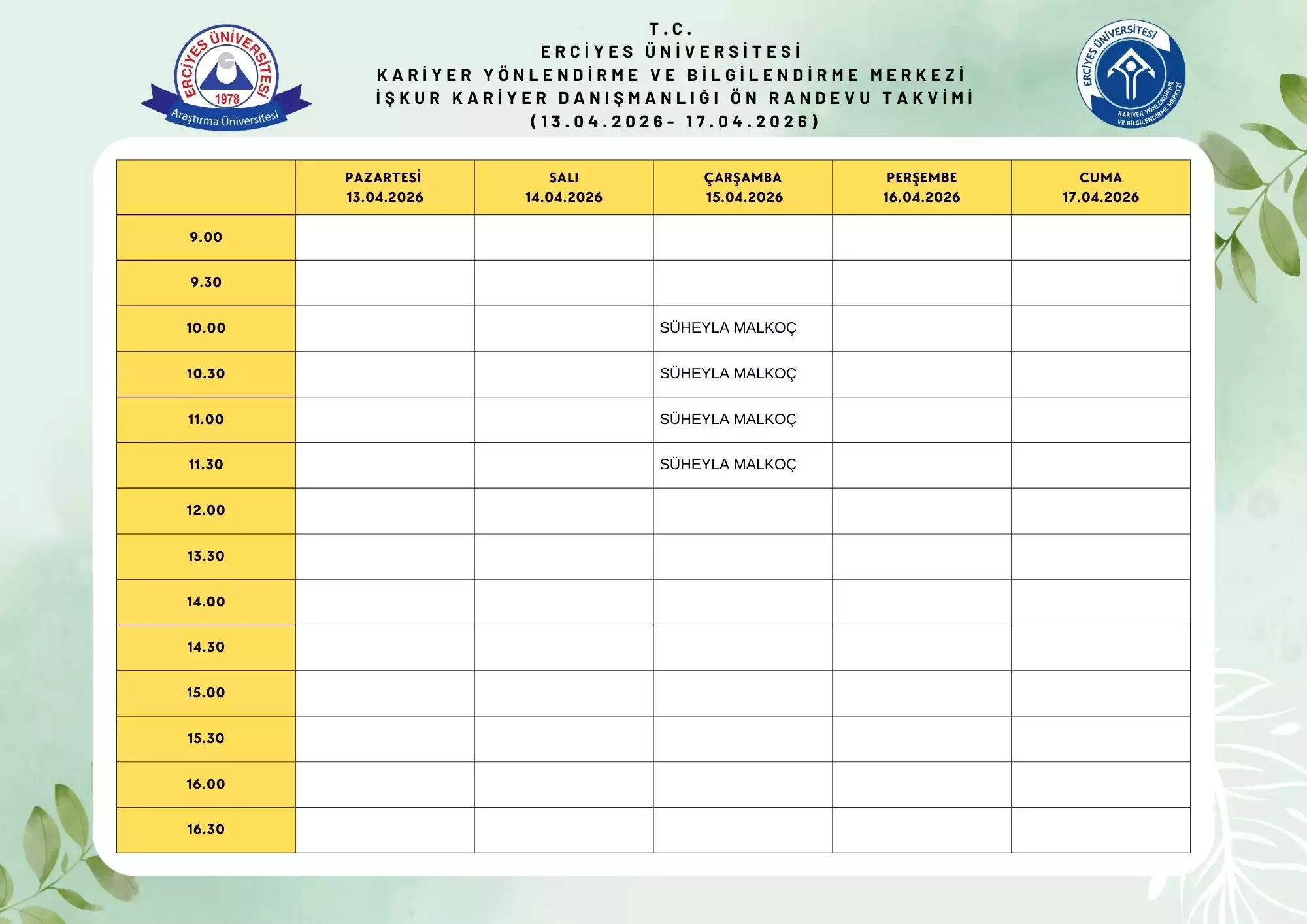Kariyer Danışmanlığı Nisan 2026 Ön Randevu Takvimi (Süheyla Malkoç)