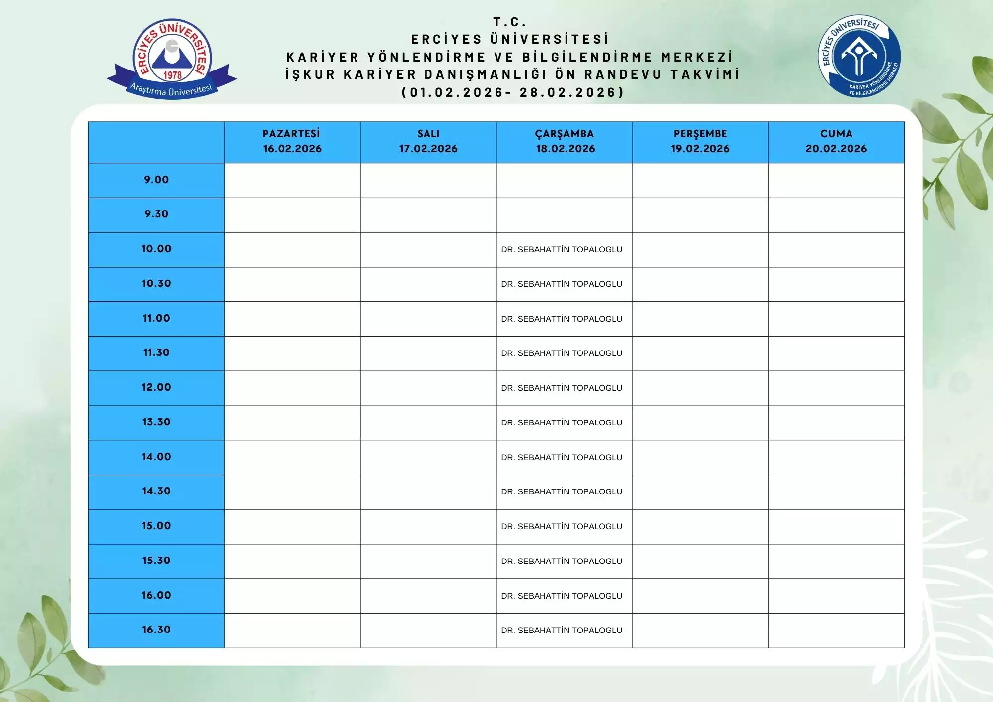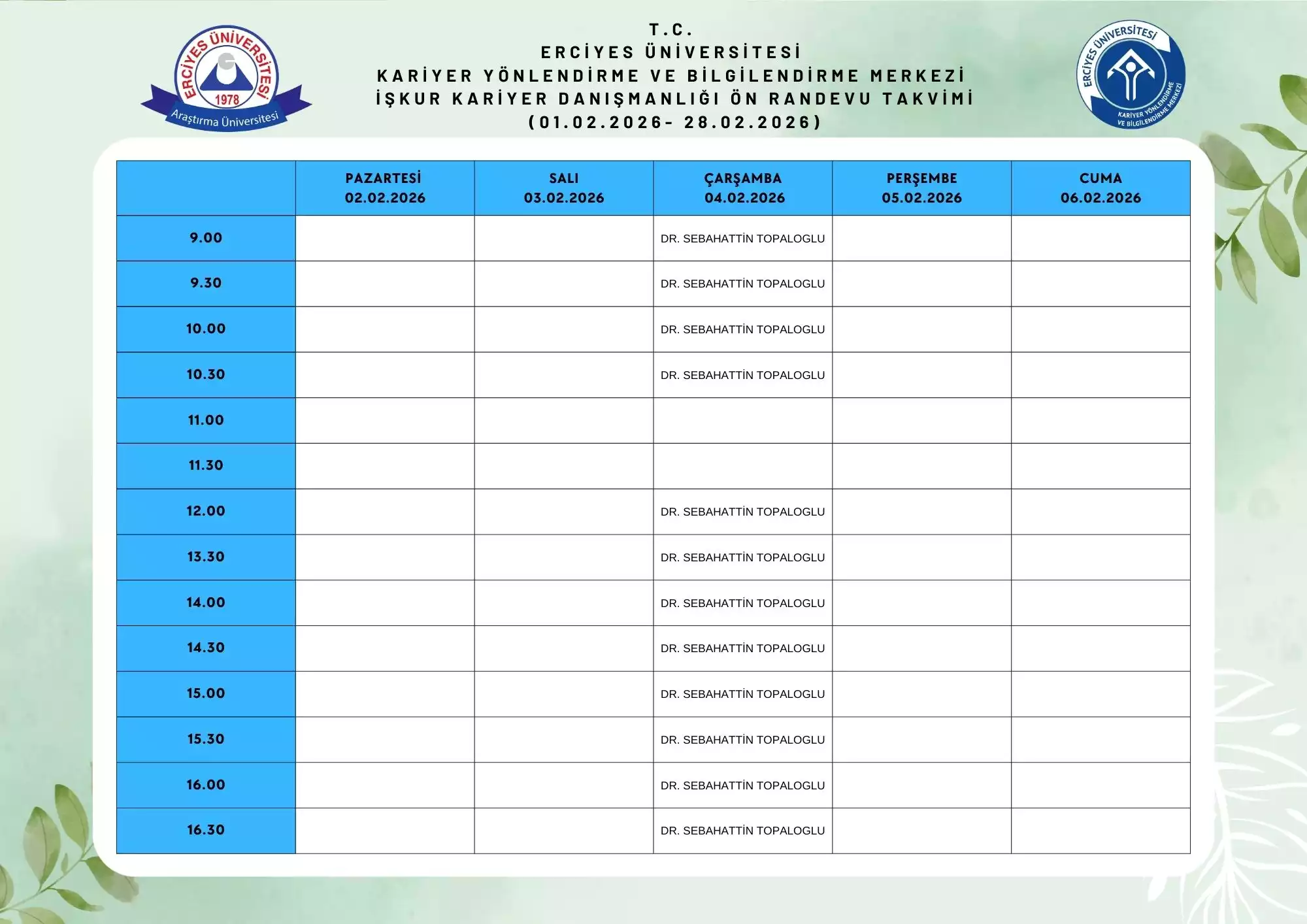 Kariyer Danışmanlığı Şubat 2026 Ön Randevu Takvimi (Dr. Sebahattin Topaloglu)