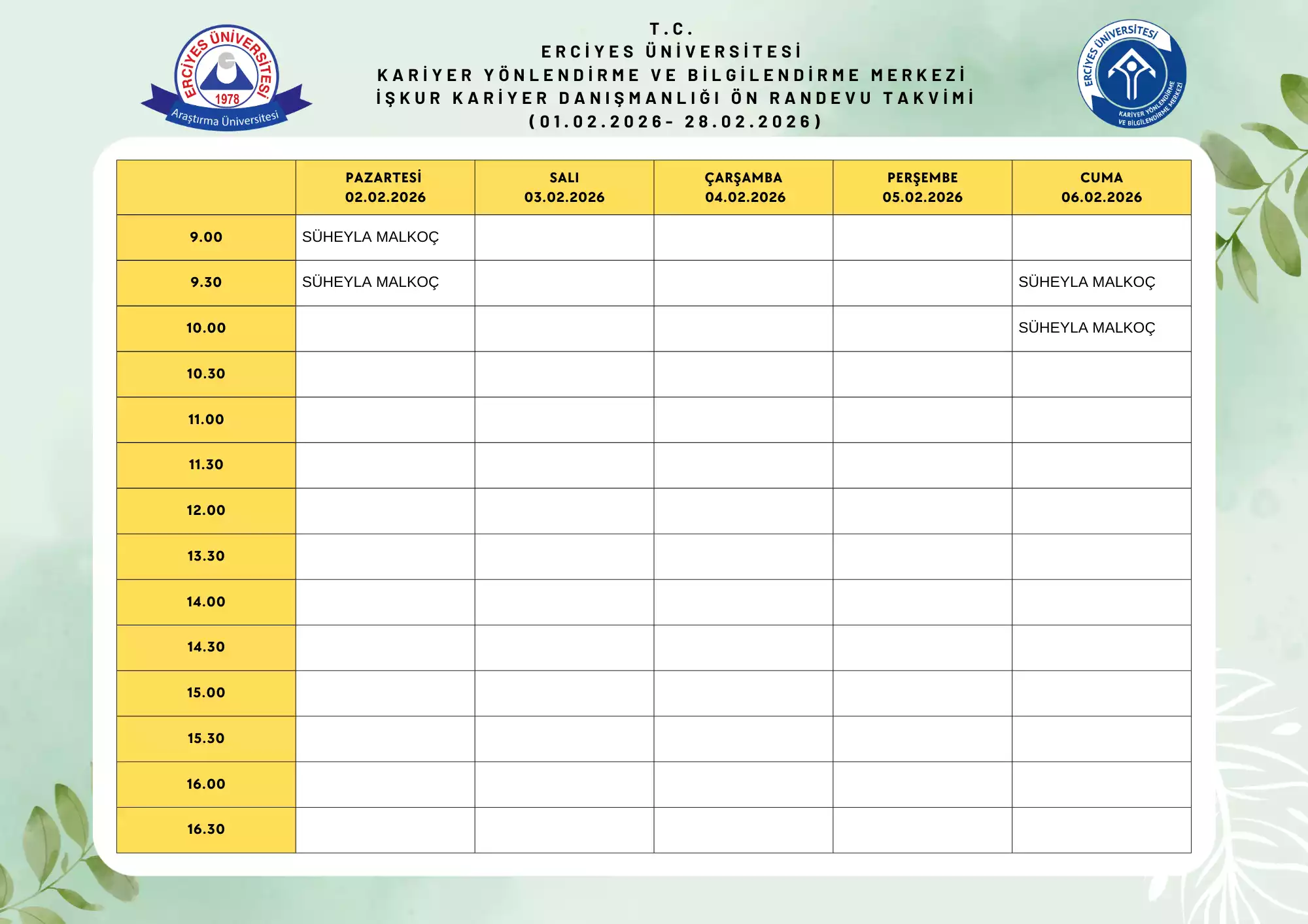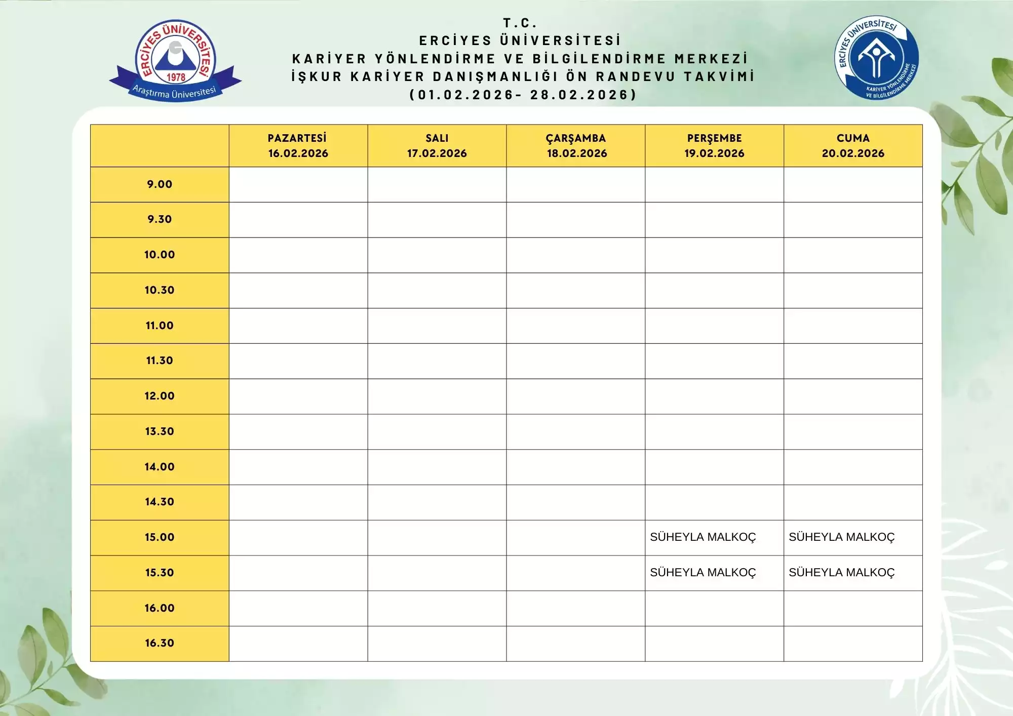 Kariyer Danışmanlığı Şubat 2026 Ön Randevu Takvimi (Süheyla Malkoç)