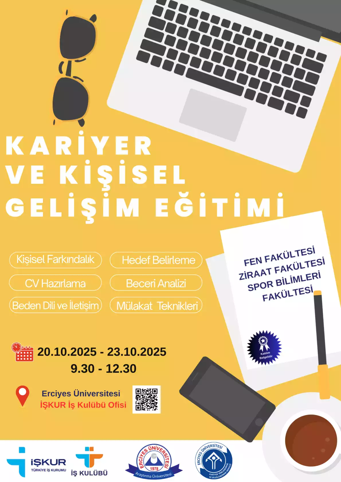Merkezimiz ve İŞKUR İş Kulübü iş birliği ile gerçekleştireceğimiz Kariyer ve Kişisel Gelişim Eğitimlerimiz 20.10.2025-23.10.2025 tarihlerinde saat 9.30-12.30 arasında İŞKUR İş Kulübü Ofisi'nde (Mahmut Has Öğrenci İşleri Merkezi Yanı) gerçekleşecektir. 4 yarım gün sürecek eğitim sonunda İŞKUR tarafından eğitime katılım sağlayan öğrencilere Katılım Belgesi verilecektir.