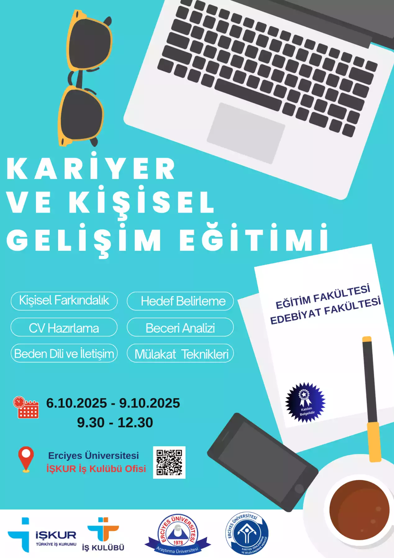 İŞKUR İş Kulübü iş birliği ile gerçekleştireceğimiz Kariyer ve Kişisel Gelişim Eğitimlerimiz 06.10.2025-09.10.2025 tarihlerinde saat 9.30-12.30 arasında İŞKUR İş Kulübü Ofisi'nde (Mahmut Has Öğrenci İşleri Merkezi Yanı) gerçekleşecektir. 4 yarım gün sürecek eğitim sonunda İŞKUR tarafından eğitime katılım sağlayan Eğitim ve Edebiyat Fakültesi öğrencilerine Katılım Belgesi verilecektir. Eğitimlerimiz 15 kişilik grup halinde gerçekleşmektedir. Başvuru sırasına göre 15 kişilik eğitim grubu oluşturulacaktır. Başvuru sırasına göre katılmak istemeyen öğrencinin yerine sonraki başvuru yapan öğrenci gruba dahil edilecektir.