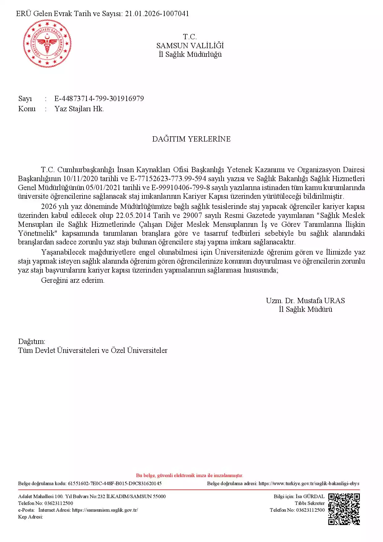 Samsun İl Sağlık Müdürlüğü Ulusal Staj Programı Yaz Stajı Duyurusu