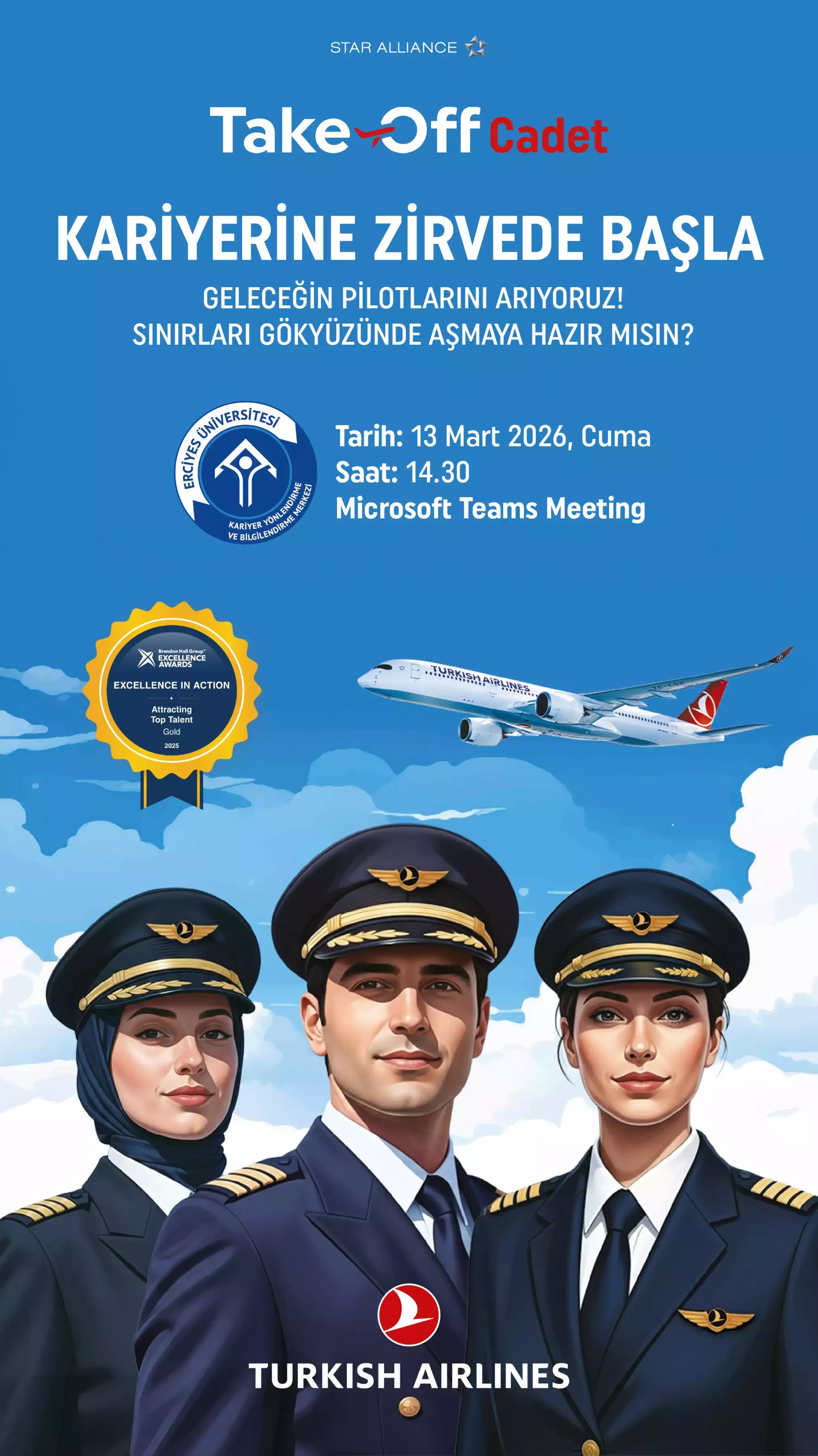 THY tarafından 13 Mart 2026 tarihinde, saat 14.30'da "Take Off Cadet- Kariyerine Zirvede Başla" programı çevrim içi olarak gerçekleştirilecektir.