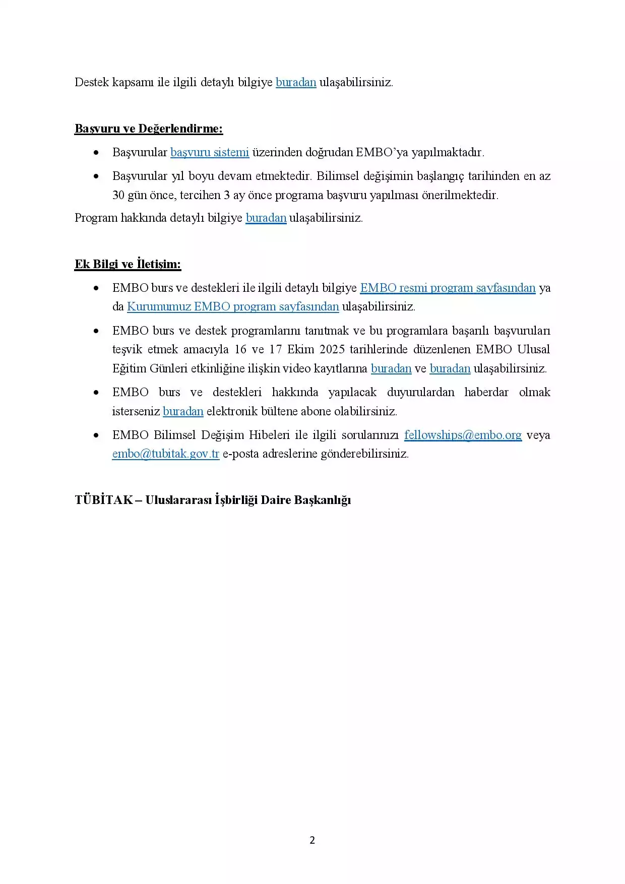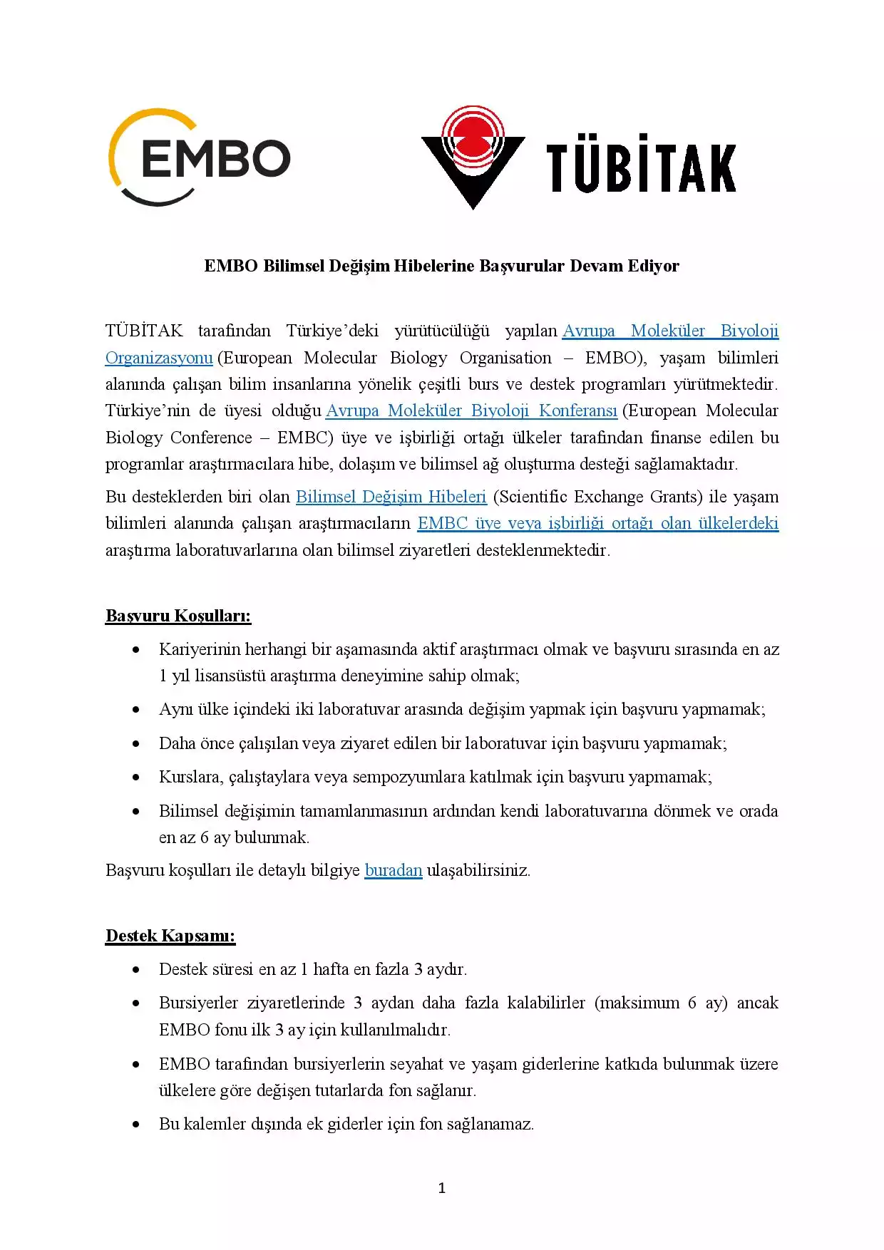 TÜBİTAK tarafından Türkiye'deki yürütücülüğü yapılan Avrupa Moleküler Biyoloji Organizasyonu (European Molecular Biology Organization - EMBO) tarafından sağlanan Bilimsel Değişim Hibeleri ve Çalıştay, Kurs ve Konferans Düzenleme Desteklerine başvurular devam etmektedir.