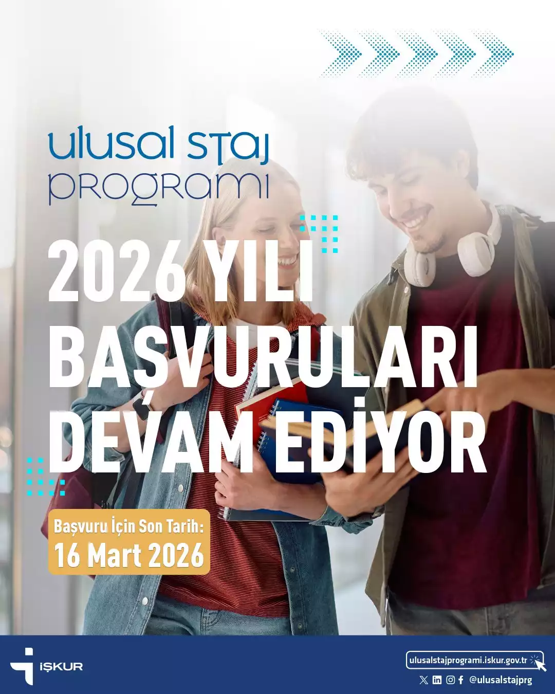 Sevgili Öğrencilerimiz; Cumhurbaşkanlığımız himayelerinde, Türkiye İş Kurumu (İŞKUR) tarafından yürütülen Ulusal Staj Programı kapsamında 2026 yılı başvuruları devam etmektedir. Program için son başvuru tarihi 16 Mart 2026'dır.