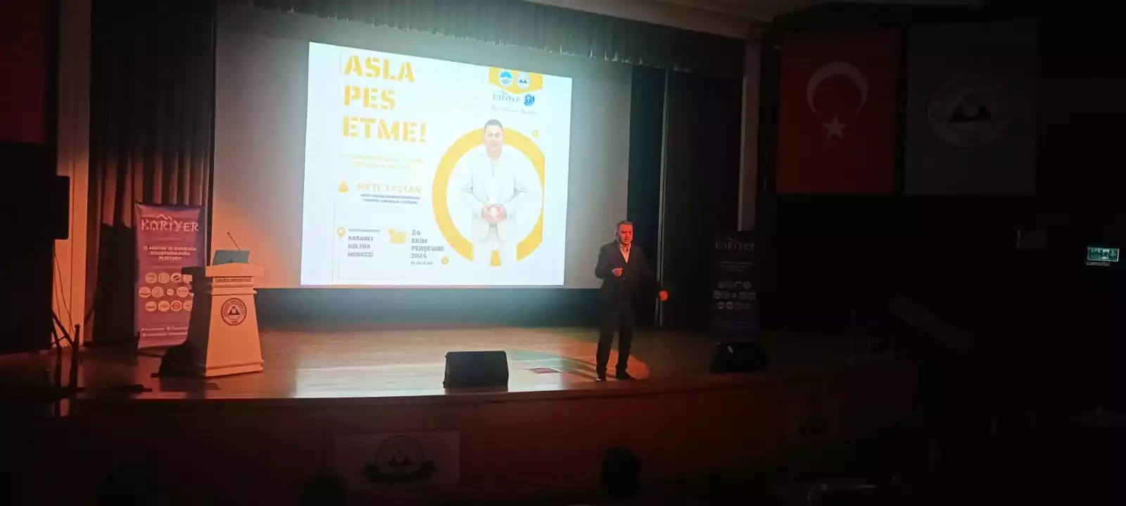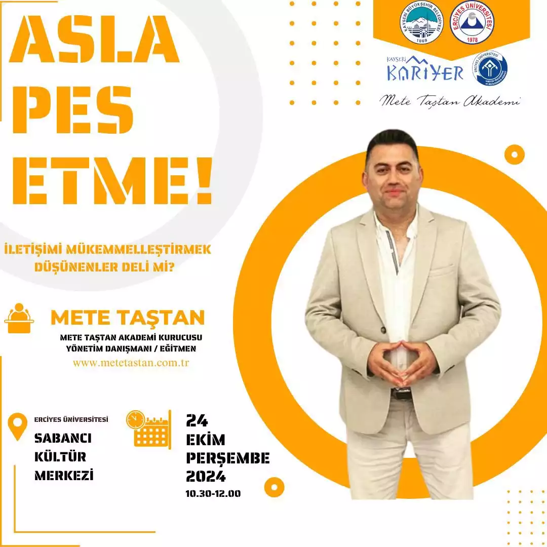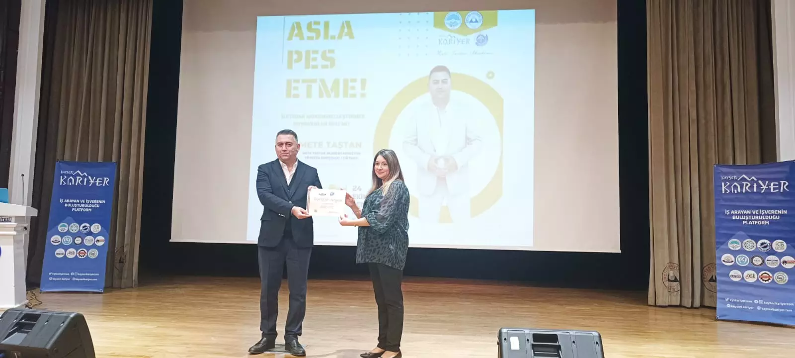 Kayseri Büyükşehir Belediyesi ve Merkezimiz koordinasyonunda 24 Ekim 2024 tarihinde saat 10.30'da Sabancı Kültür Merkezi'nde Mete Taştan'ın konuşmacı olduğu "Asla Pes Etme'!" isimli konferans gerçekleştirildi. Program sonunda Merkez Müdür Yardımcımız Dr. Öğr. Üyesi Servet Merve Kırnap Dönmez tarafından Mete Taştan'a teşekkür belgesi takdim etti.
