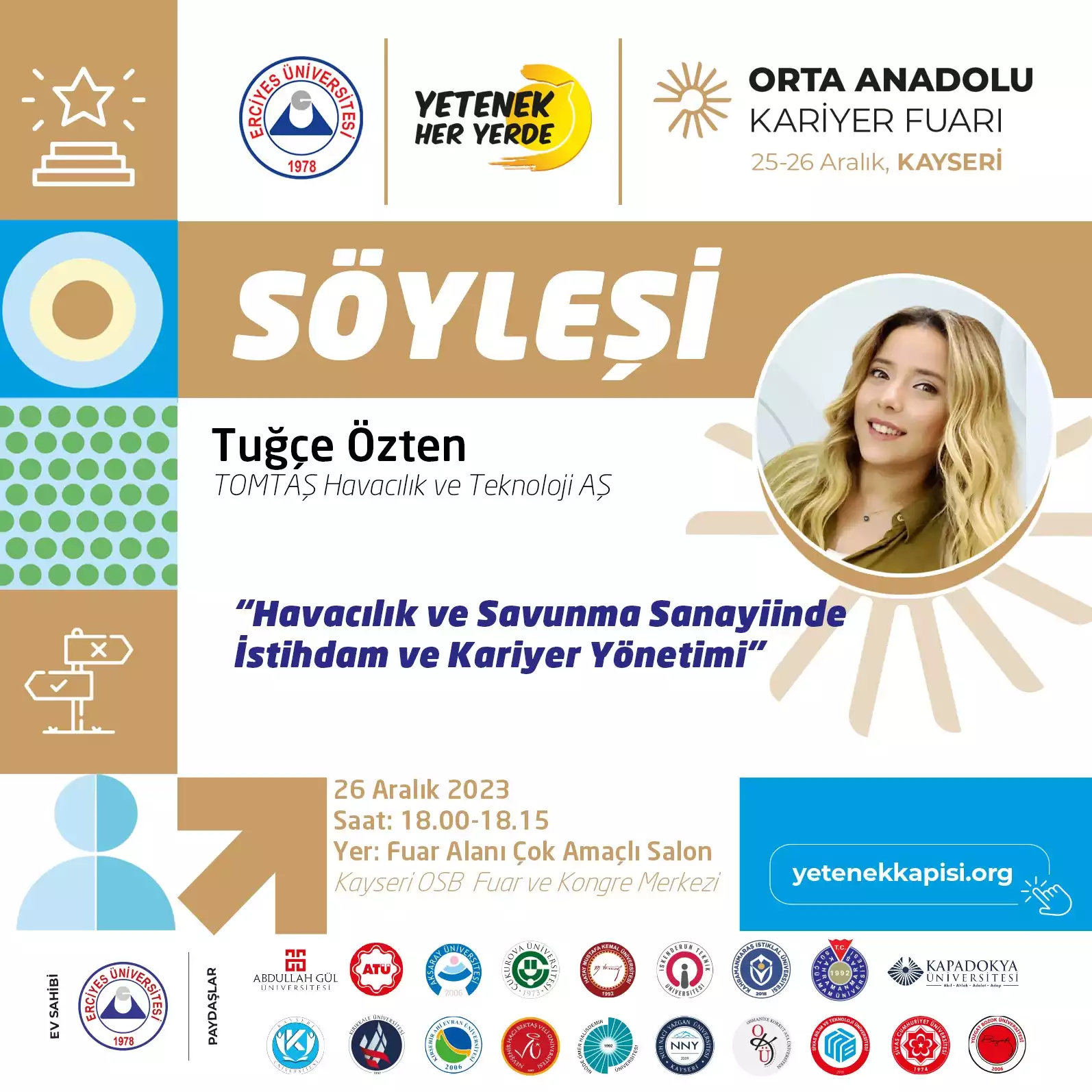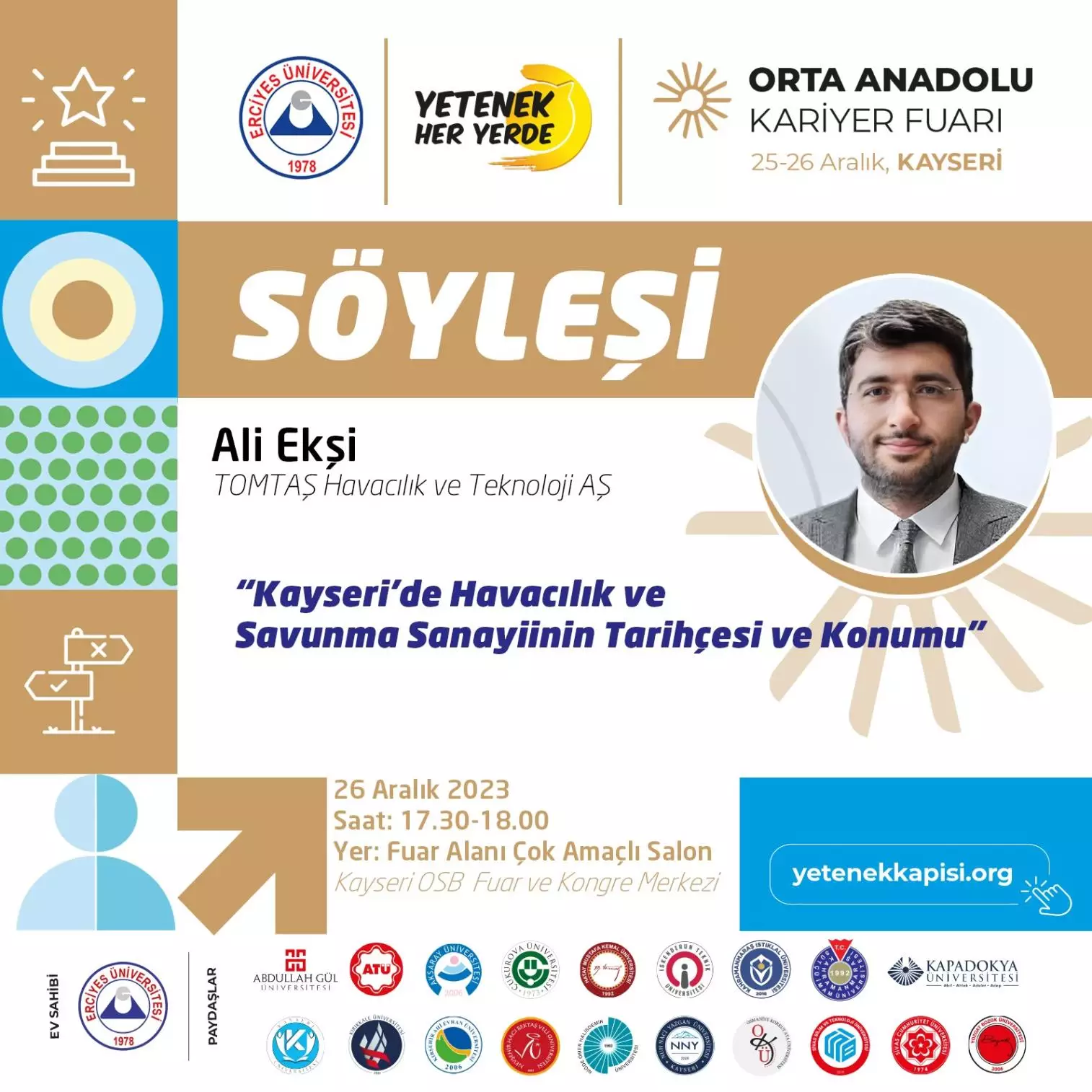 Orta Anadolu Kariyer Fuarı’nda (ORAKAF’23) TOMTAŞ Havacılık ve Teknoloji AŞ tarafından "Havacılık ve Savunma Sanayiinde İstihdam ve Kariyer Yönetimi" ve "Kayseri'de Havacılık ve Savunma Sanayiinin Tarihçesi ve Konumu" adlı söyleşiler 26 Aralık 2023 tarihinde, Fuar Alanı Çok Amaçlı Salon’da düzenlendi. Etkinliğin ardına katılımcılara, katkılarından dolayı Kariyer Yönlendirme ve Bilgilendirme Merkezi (KAYBİMER) Müdürü Sayın Mehmet Ali Bahar tarafından teşekkür belgesi teslim edildi.